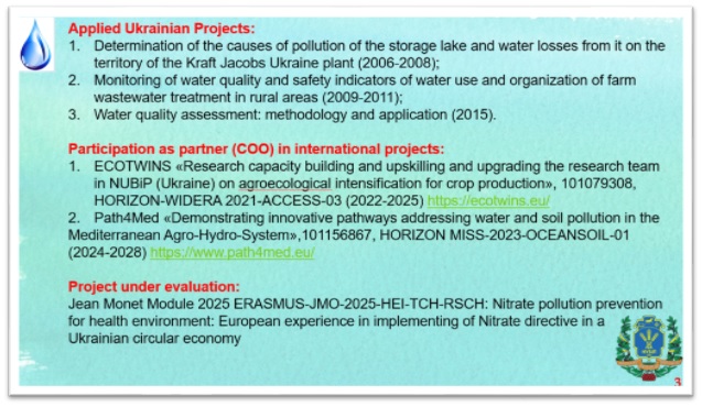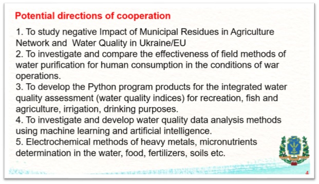 Ми запропонували перелік потенційних напрямків, які могли стати основою для подальшого співробітництва та участі в спільних інноваційних програмах: - Вивчити негативний вплив комунальних відходів на сільськогосподарські мережі та якість води в Україні та ЄС; - Дослідити та порівняти ефективність польових методів очищення води для питних цілей в умовах війни росії з Україною та населення, яке перебуває у зоні військових дій та не має доступу до якісної питної води; - Розробити програмне забезпечення для розрахунку індексів якості води для різних видів водокористування, у тому числі в сільськогосподарському виробництві; - Розробити та впровадити методи обробки великих масивів даних аналітичних досліджень та прогнозу якості води на основі машинного навчання та використання штучного інтелекту; - Розробити електрохімічні методи визначання вмісту важких металів, мікроелементів у воді, харчових продуктах, ґрунтах, добривах тощо.
