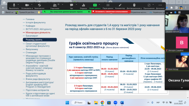 Відповідно до графіка освітнього процесу на другий семестр 2022/2023 н.р. з 3 квітня 2023 року здобувачі вищої освіти 3 курсу продовжать навчання у режимі офлайн. У зв’язку з цим для обговорення ряду важливих питань 22 березня 2023 року в онлайн режимі відбулася зустріч здобувачів вищої освіти 3 курсу 3 групи факультету аграрного менеджменту з наставником доцентом кафедри менеджменту ім. проф. Й. С. Завадського Оксаною Гавриш. Актуальними питаннями в обговоренні були: продовження занять в офлайн режимі, поточний стан успішності здобувачів вищої освіти, відвідування ними занять та правила поведінки під час повітряної тривоги.