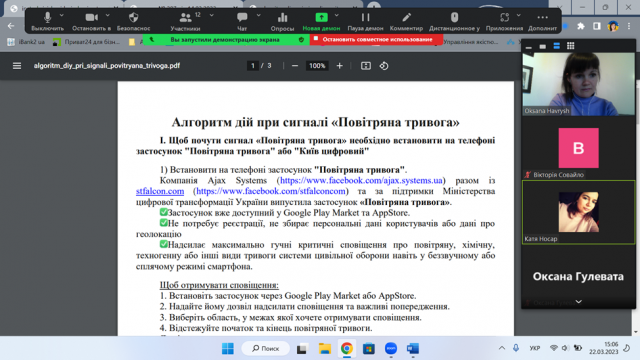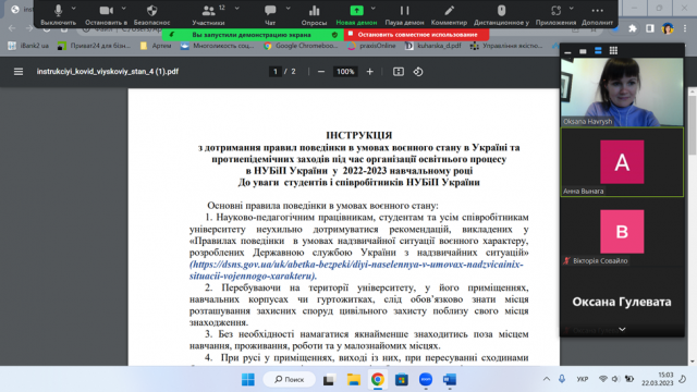Під час зустрічі Оксана Миколаївна поцікавилася станом здоров’я студентів та готовністю кожного відвідувати заняття в режимі офлайн. Наголосила на правилах поведінки під час сигналу «Повітряна тривога» та провела інструкцію з дотримання правил поведінки в умовах воєнного стану в Україні та протиепідемічних заходів під час організації освітнього процесу в НУБіП України.