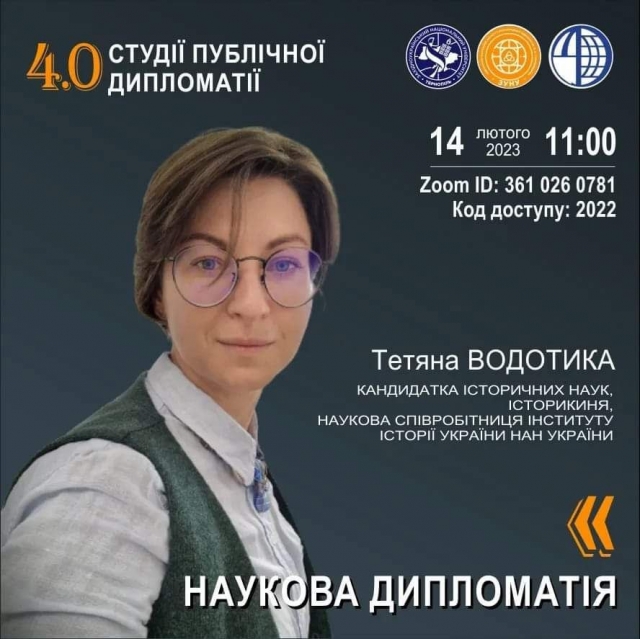 14 лютого 2023 року, студенти та аспіранти кафедри взяли участь в онлайн-зустрічі на тему «Наукова дипломатія» з науковою співробітницею Інституту історії України НАН України, шеф-редактором е-журналу урбаністичних студій «Місто: історія, культура, суспільство», співавтором книги «Ігри відображень. Якою Україну бачить світ» Тетяною Водотикою.