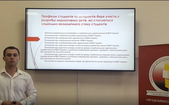 Про напрямки діяльності профспілкової організації студентів та аспірантів університету проінформував Олексій Мельник. Дмитро Кушпій– новообраний голова студентської організації розповів про основні напрями діяльності громадських організацій університету, культурно-виховні заходи, які стали традицією Університету.