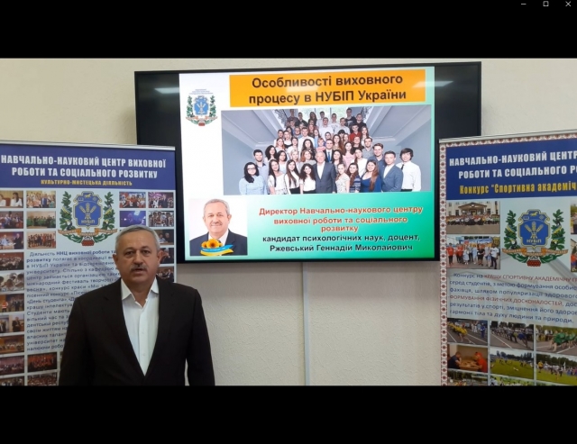 Геннадій Ржевський – директор ННЦ виховної роботи та соціального розвитку – ознайомив учасників онлайн-школи першокурсників із метою та основними напрямами діяльності Центру, існуючих можливостях для активного відпочинку і розвитку студентської молоді в НУБіП України.