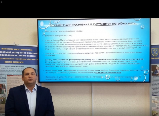 Директор студентського містечка НУБіП України Сергій Стецюк повідомив першокурсників про особливості поселення та проживання в гуртожитках Університету і, зокрема, в умовах карантинних обмежень, необхідність дотримання в обов’язковому порядку правил внутрішнього розпорядку в гуртожитках та санітарних правил.