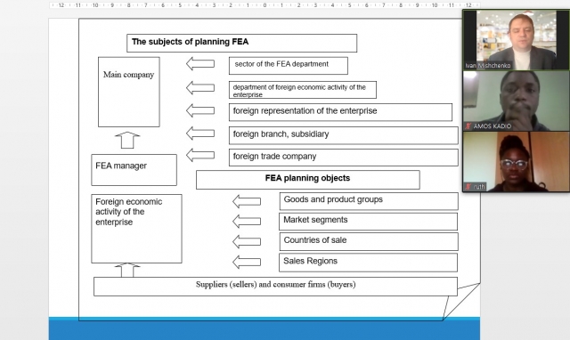 Протягом весняно-літнього семестру доцент кафедри адміністративного менеджменту та ЗЕД Іван Міщенко продовжив процес активного викладання курсу для студентів магістратури спеціальності «Менеджмент ЗЕД»: Техоуа Кадіо Жан Амос (Tehoua Kadio Jean Amos) (Кот-д’Івуар) і Фадоджу Руф (Fadoju Ruth) (Нігерія).
