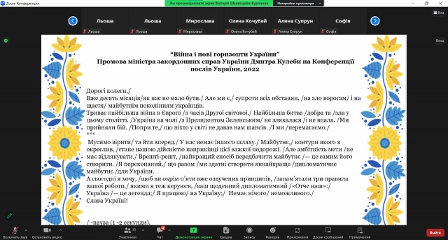 Також, учням було запропоновано проаналізувати та презентувати промову міністра закордонних справ України Дмитра Кулеби «Війна і нові горизонти України».