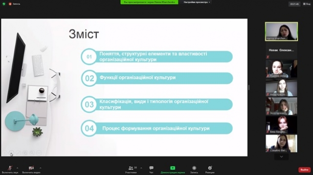 Під час заняття розглядались питання сутності, видів та типології організаційної культури. Також викладач розкрила  функції та  структурні елементи організаційної культури. Г. А. Харченко зауважила, що організаційна культура є важливим чинником у розвитку потенціалу організації, підвищення її ефективності, адаптивності та конкурентоспроможності. Разом з  цим, лектором було відмічено, що організаційна культура в системі управління організацією повинна розглядатися як вагомий стратегічний інструмент, що дає можливість орієнтувати усі підрозділи організації на загальні цілі, підвищувати ініціативу працівників, покращувати комунікації тощо.