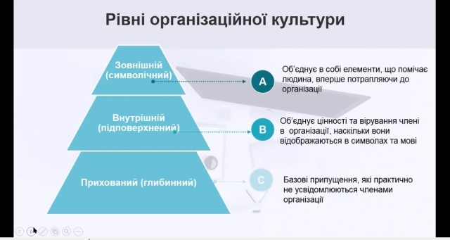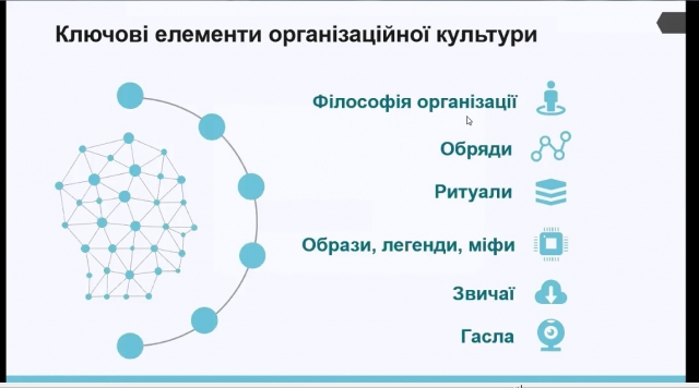 Заняття супроводжувалося цікавим та змістовним презентаційним та відео матеріалами, що дозволило лекторові всебічно висвітлити тему лекції та виявити інтерес з боку студентів. Протягом заняття відбулося активне обговорення студентами цікавих фактів з формування організаційної культури на прикладі таких відомих організацій,  як Google, Disney, Nestle, Netflix.