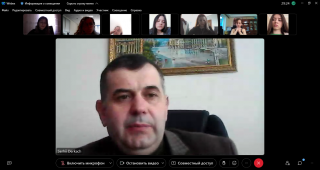 Заступник декана Сергій Деркач акцентував увагу здобувачів вищої освіти на питаннях організації освітнього процесу на факультеті у другому семестрі 2022-2023 н.р. Довів інформацію до старост студентських груп, що з 6 березня виходять на очне навчання здобувачі вищої освіти 1, 2 і 6 курсу та магістри на базі ОС Бакалавр. Закликав студентів до активної роботи в період очного навчання.