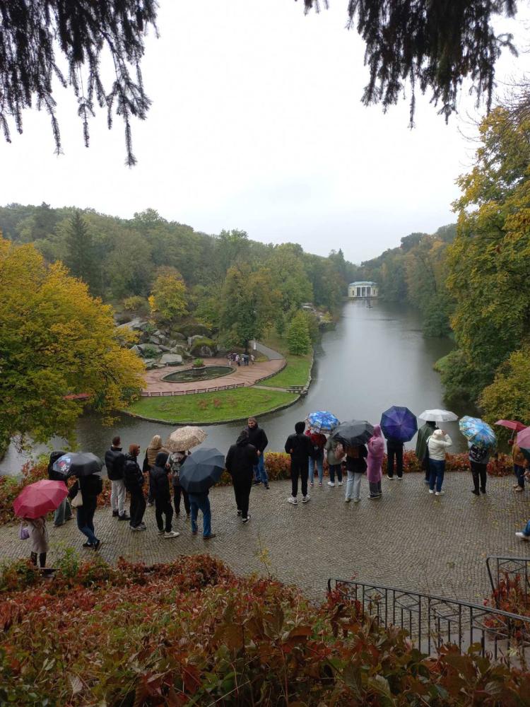Дендропарк зустрів тихим дощем серед яскравих осінніх барв. І це створювало свій неповторний настрій і атмосферу, яка залишиться в пам’яті надовго. Розпочали знайомство з партерного амфітеатру – найурочистішої частини парку. Тут все зелене і квітуче – самшитові бордюри створюють неповторний візерунок, який заповнюють ніжні хризантеми і айстри. Далі нас чекав маршрут основними історичної частини парку – обеліск, вид на Нижнє озеро, джерело Гіпокрени, площа Зборів…