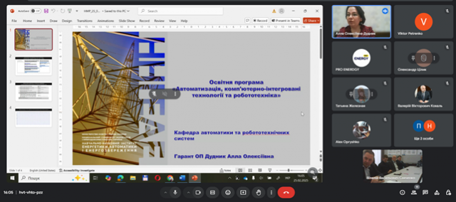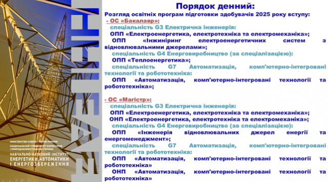 Відповідно до Закону України «Про вищу освіту» та постанови Кабінету Міністрів України від 30.08.2024 № 1021 «Про внесення змін до переліку галузей знань і спеціальностей, за якими здійснюється підготовка здобувачів вищої та фахової передвищої освіти» та стандартами вищої освіти відповідних спеціальностей на засіданні гаранти презентували освітні програми для вступників 2025 року: ОС «Бакалавр» - Олександром СИНЯВСЬКИЙ (ОПП «Електроенергетика, електротехніка та електромеханіка»), Світлана МАКАРЕВИЧ (ОПП «Інжиніринг електроенергетичних систем з відновлювальними джерелами»), Олена ШЕЛІМАНОВА (ОПП «Теплоенергетика»), Алла ДУДНИК (ОПП «Автоматизація, комп'ютерно-інтегровані технології та робототехніка»)) та ОС «Магістр» - Сергій УСЕНКО і Валерій КРИВОНОСОВ (ОПП та ОНП «Електроенергетика, електротехніка та електромеханіка»), Валерій ГОРОБЕЦЬ (ОПП «Інженерія відновлювальних джерел енергії та енергоменеджмент»), Тарас ЛЕНДЄЛ та Вячеслав ІВАЩУК (ОПП та ОНП «Автоматизація, комп'ютерно-інтегровані технології та робототехніка».