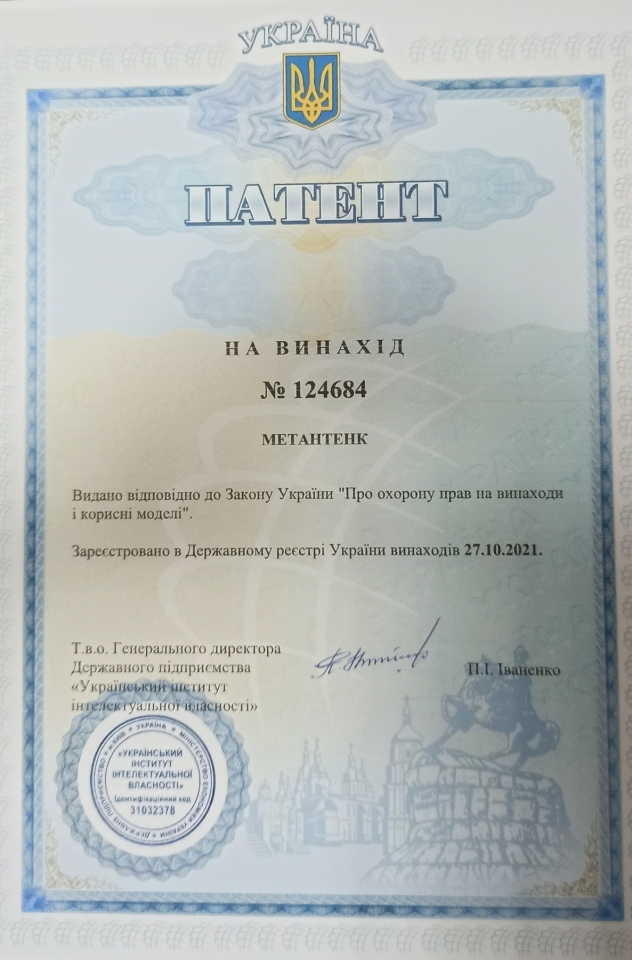 Співробітниками кафедри тракторів, автомобілів та біоенергоресурсів проф. Голубом Г.А. та доц. Марусом О.А. отримано патент України на винахід N 124684 "Метантенк". Даний винахід належить до сільського господарства і може бути використаний у складі біогазових установок для виробництва біогазу та органічних добрив із рідкого гною та посліду.