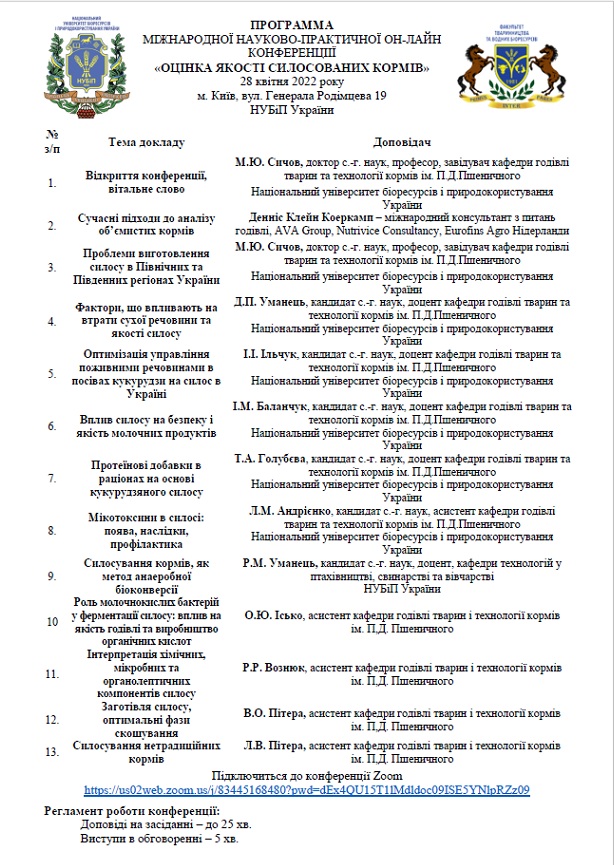 28 квітня 2022 р. на кафедрі годівля тварин та технології кормів ім. П.Д. Пшеничного було проведено Міжнародну науково-практичну он-лайн конференцію «Оцінка якості силосованих кормів» присвячену сучасним та інноваційним методам оцінки якості об’ємистих кормів.