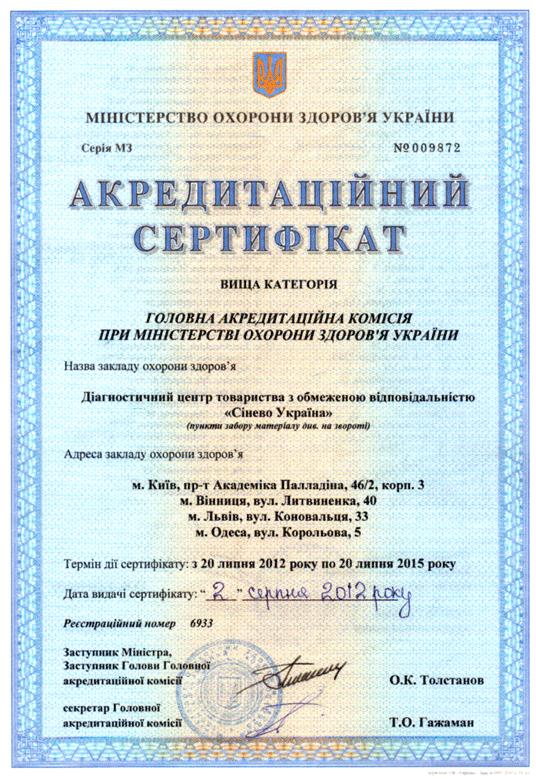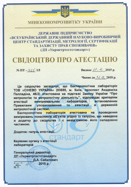 Система управління якістю лабораторії «Сінево Україна» підтверджена сертифікатами відповідності ДСТУ ISO 9001-2009 (ISO 9001- 2008).