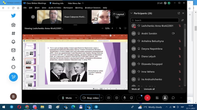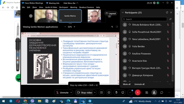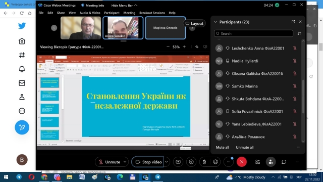 Педагогічна практика проходила в складних умовах воєнного часу, через що семінарські заняття відбувалися переважно дистанційно та з перервами в разі оголошення повітряних тривог та супроводжувалися певними складнощами із під’єднанням студентів через перебої зі зв’язком. Попри вказані обставини, студенти виявляли значну активність на семінарських заняттях та в процесі підготовки до них, зокрема готували презентації, виступали з доповідями й доповненнями до них, завдяки чому вдалося розглянути практично всі теми семінарських занять курсу від початків державності на українських теренах до проблематики нинішнього українського державотворення.