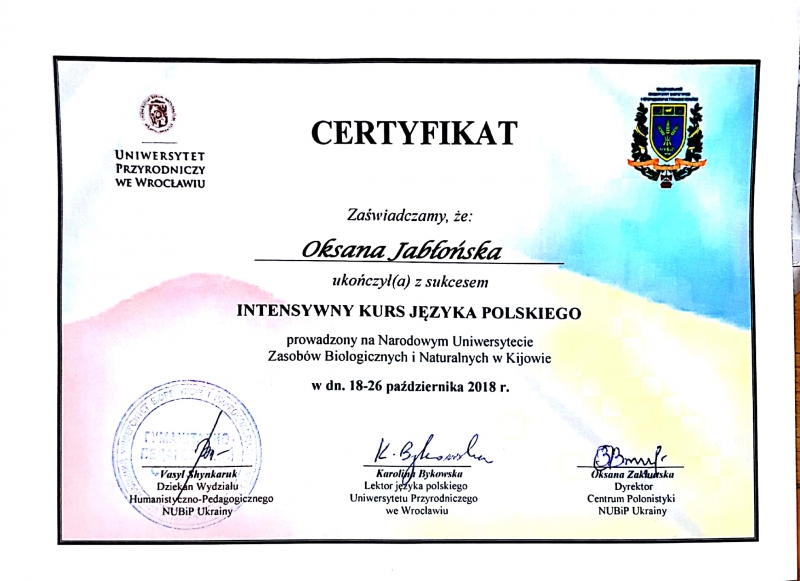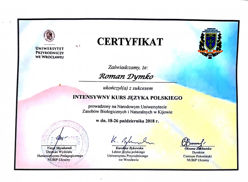 18-26 жовтня 2018 року в Центрі полоністики гуманітарно-педагогічного факультету НУБІП України проходив інтенсив з поглибленого вивчення польської мови. Усього на курс інтенсиву записалося понад 50 чоловік – студентів та викладачів. Факультет ветеринарної медицини представляли педагоги кафедри мікробіології, вірусології та біотехнології – професор Оксана Яблонська та асистент Роман Димко.