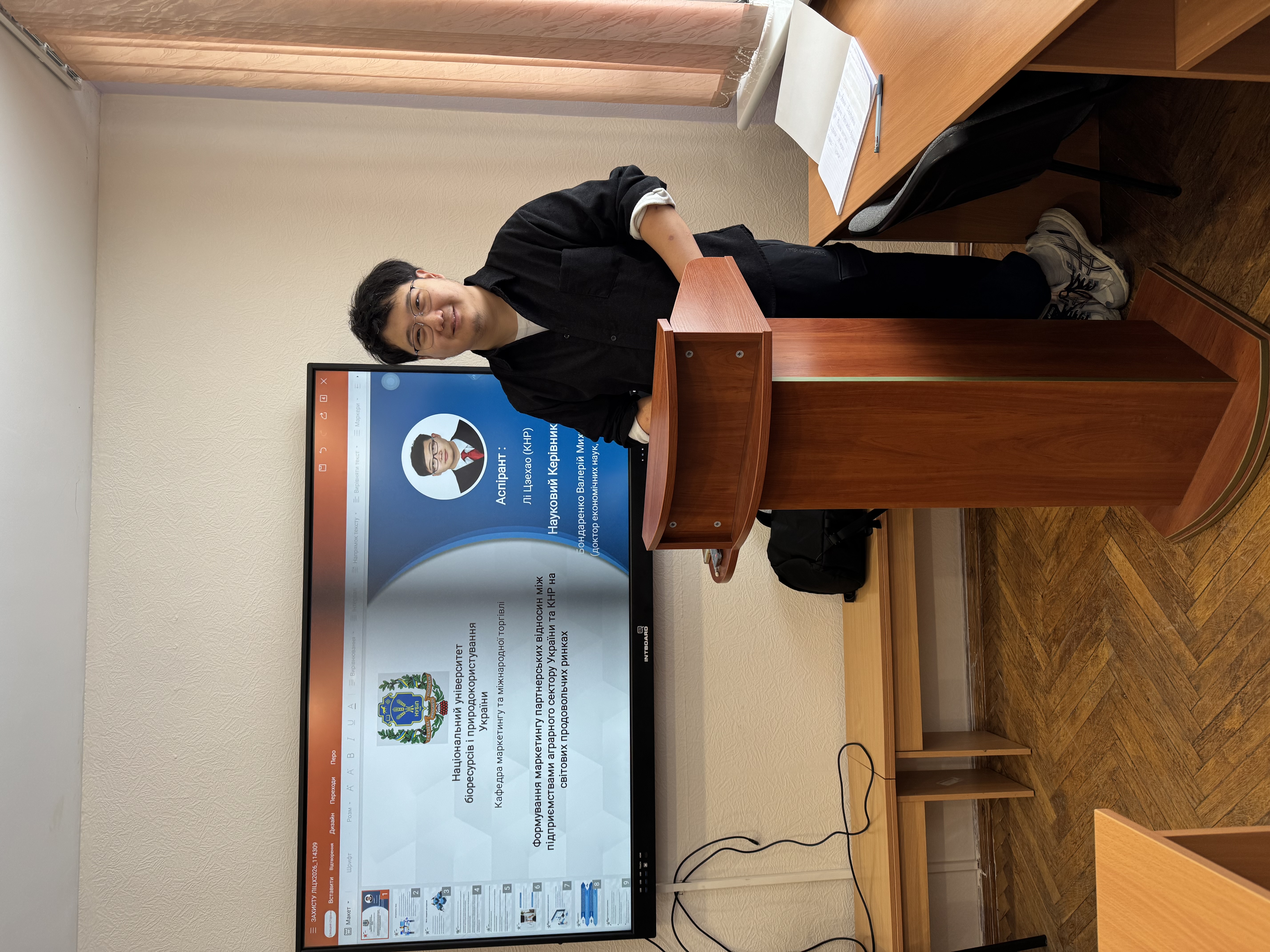 Тема дисертаційної роботи: «Формування маркетингу партнерських відносин між підприємствами аграрного сектору України та КНР на світових продовольчих ринках». У своєму виступі здобувач представив теоретико-методичні підходи до формування системи маркетингу партнерських відносин, обґрунтував актуальність тематики в умовах трансформації світових продовольчих ринків та розвитку міжнародного аграрного співробітництва.