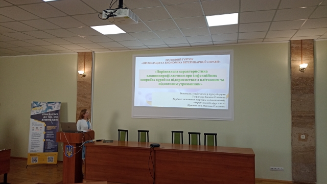 1 - МІСЦЕ здобула Тюфанова Іванна Олегівна (5 курс 6 група), науковий керівник: Жуковський Максим Олегович, асистент. Науковий гурток: «Організація та економіка ветеринарної справи» на тему: «Порівняльна характеристика вакцинопрофілактики при інфекційних хворобах курей на підприємствах з клітковим та підлоговим утриманням», кафедра епізоотології, мікробіології і вірусології.