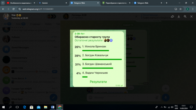12.08.2024р відбулось зібрання для переобрання старости групи, через відсторонення діючого від своїх обов’язків, за власним бажанням. Рішення про обрання Ковальчука Богдана було прийнято шляхом голосуванням у чаті групи.