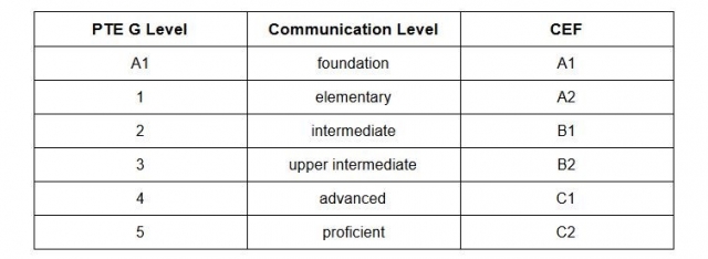 PTE екзамени мають 6 рівнів, відповідно до Загальноєвропейської системи оцінювання володіння іноземною мовою (Common European Framework - CEFR) та мають акредитацiю Ofqual, Велика Британiя (Office of Qualifications and Examinations Regulation – державна организацiя, яка контролює та регулює стандарти i якiсть іспитів i тестiв в Англiї та Пiвнiчнiй Iрландiї), а саме: