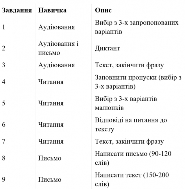 Level A1 (Рiвень A1): Даний іспит призначений для пiдтвердження знання основ англiйської мови, достатнiх для спiлкування у повсякденних ситуацiях i подорожах. (Тривалість екзамену: письмова частина - 1 год 15 хв, усна частина -5 хв)