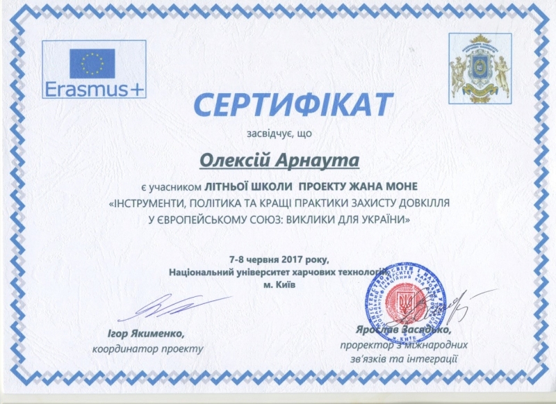 7-8 червня 2017 року на базі Національного університету харчових технологій (м. Київ) проходила Літня школа проекту Жана Моне «Інструменти, політика та кращі практики захисту довкілля у Європейському Союзі: виклики для України». Учасником цього заходу був доцент кафедри біохімії ім. акад. М.Ф. Гулого Арнаута Олексій.