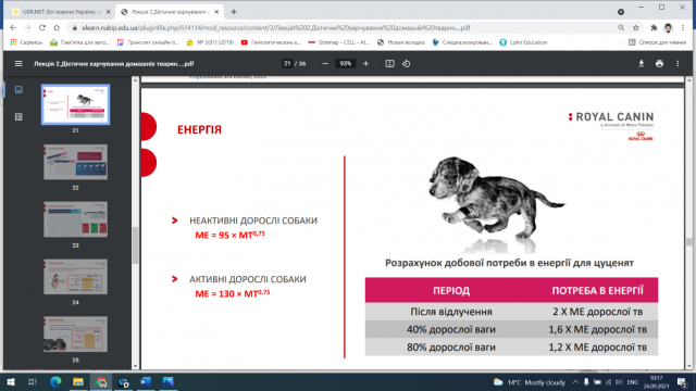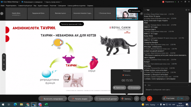 Саме за участі експерта з наукових комунікацій компанії «Рояль Канін Україна» Юлії Романишиної 6 вересня 2021 р. в онлайн-режимі на базі платформи Cisco Webex Meetihg була проведена перша лекція «Основні поживні речовини корму (нутрієнти). Хто встановлює норми?».
