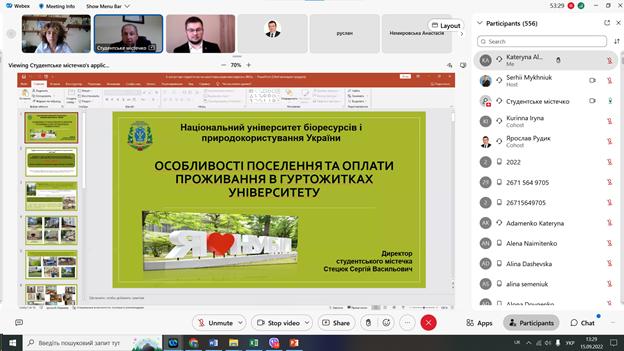 Щодо процедури поселення та оплати проживання в гуртожитках університету студентів поінформував Директор студентського містечка Сергій Стецюк. На слайді були фотографії гуртожитків НУБіП України, зокрема, і гуртожитку №2, де проживають студенти факультету аграрного менеджменту.