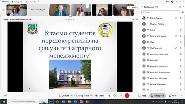 Декан факультету аграрного менеджменту Анатолій Остапчук першим привітав своїх студентів. Він познайомив присутніх зі структурою факультету, адміністрацією та співробітниками деканату, представив завідувачів кафедр факультету та наставників академічних груп студентів першого курсу.