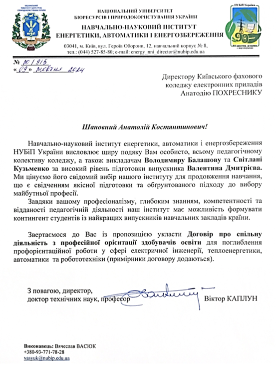 Сподіваємось, що у наступному році нашими абітурієнтами стануть випускники, які змагатимуться за право опановувати складний інженерний за спеціальностями 141 «Електроенергетика, електротехніка та електромеханіка», 144 «Теплоенергетика», 174 «Автоматизація, комп'ютерно-інтегровані технології та робототехніка».