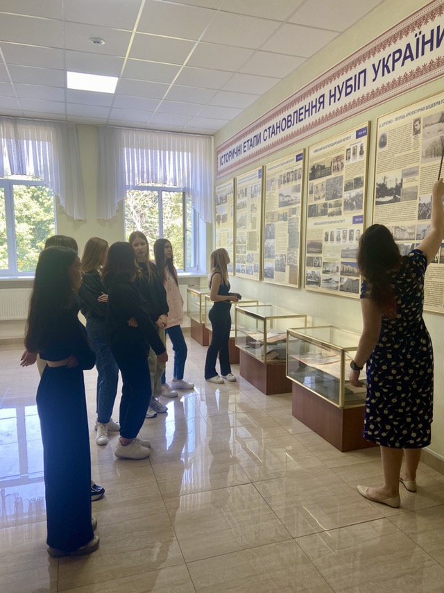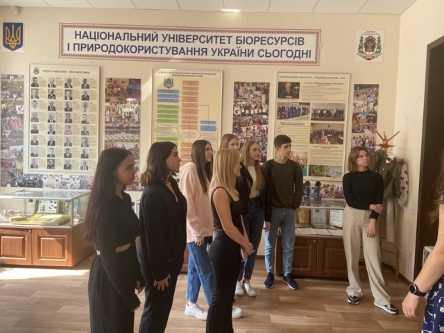 Уже місяць триває освітній процес для здобувачів вищої освіти. Кожного дня вони пізнають особливості організації освітнього процесу, здобувають нові знання з відповідних дисциплін, знайомляться з роботою студентського самоврядування, а також із історією Університету. Так, 14 вересня 2023 року студенти 4 групи 1 курсу факультету аграрного менеджменту разом зі своїм куратором Мар’яною Добрівською відвідали музей історії НУБіП України, який більше ніж пів століття популяризує багату історію нашого славетного університету.