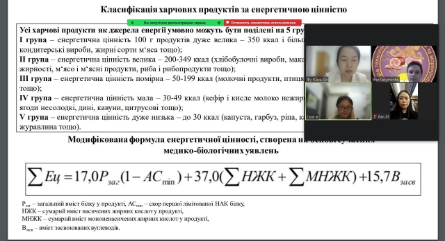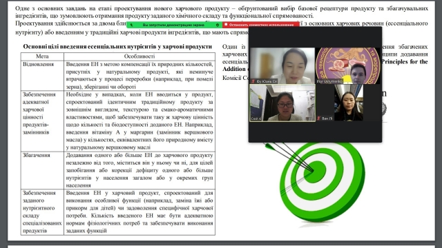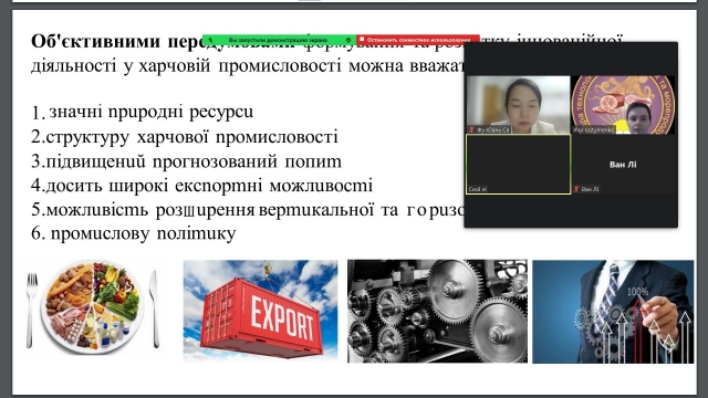 Під час перших занять з дисципліни “Інноваційні технології у харчовій промисловості” здобувачам PhD доктор філософії з Китайської Народної Республіки були висвітлені питання щодо мети і принципів інноваційної політики, принципів удосконалення харчових технологій, наукового обгрунтування потреб нутрієнтів, зокрема, есенціальних для організму людини, використання есенціальних нутрієнтів як одних з шляхів удосконалення існуючих та розроблення нових технологій харчових продуктів.