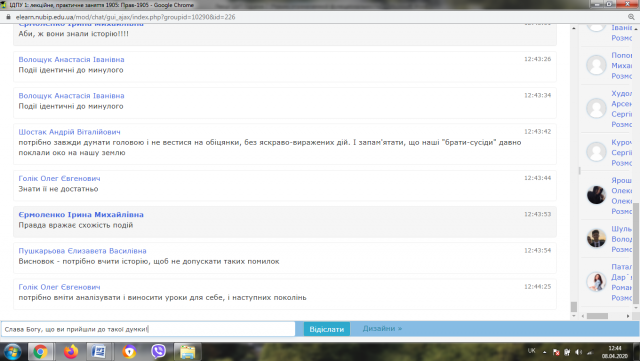 Зі свого боку хочу сказати, що основної поставленої мети в ході викладання дисципліни: навчити студента аналізувати, проводити паралелі між минули і сучасним, та вчитися на своїх помилках, більшою мірою мною було досягнуто, про що свідчать студентські коментарі в чаті на платформі Elearn під час занять.
