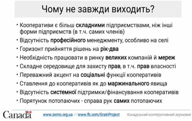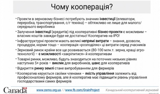 Нині побудувати зерновий елеватор є досить складним процесом, це потребує значних як фінансових інвестицій, так і непрямих інвестицій у навчання членів кооперативу, отриманні відповідних дозволів, дотримання належних процедур у роботі тощо. Тому кооперація дозволяє розподілити ці витрати між всіма членами кооперативів. Також розповів, які виклики постають перед фермерськими господарствами в умовах сьогодення, в результаті реалізації ринку сільськогосподарської землі тощо.
