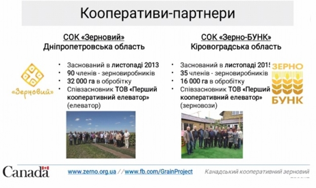 Ці кооперативи являються партнерами і ведуть плідну співпрацю із співзасновником ТОВ «Перший кооперативний елеватор». СОК «Зерновий» створений у 2013 році і знаходиться у Дніпропетровській області, налічує 90 членів – зерновиробників. СОК «Зерно-БУНК» знаходиться у Кіровоградській області, заснований у 2015 році та налічує 35 членів – зерновиробників.