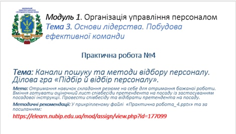 Практичні роботи з дисципліни проходять з максимальним залученням студентів. Зокрема остання відбулася у вигляді ділової гри, де студенти навчалися відбору та підбору персоналу. Адже ефективність діяльності організації перш за все залежить від якості персоналу.