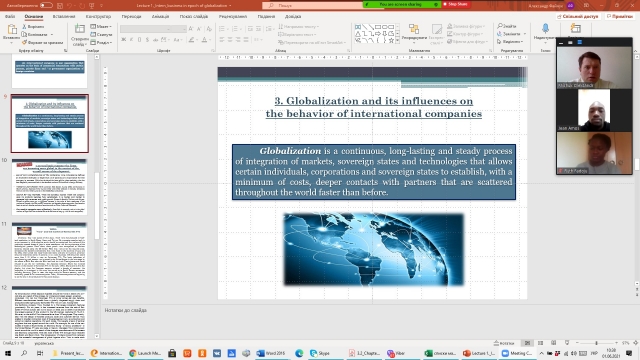 Слід заначити, що студенти мають можливість в онлайн форматі прослухати і задати запитання лектору щодо наступних дисциплін: Міжнародний бізнес (International business), Модель європейського регіонального розвитку (Model of the European regional development) і Методологія наукових досліджень (Methodology of scientific research).