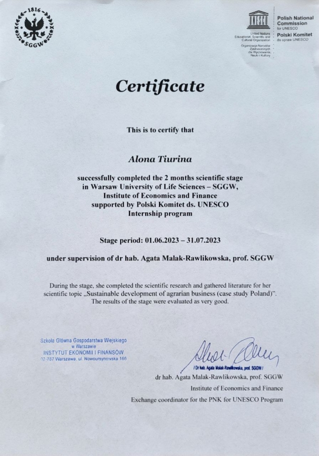 З 01.06.2023 року по 31.07.2023 року доцент кафедри адміністративного менеджменту та ЗЕД Альона Тюріна працювала над науковим дослідженням на тему «Сталий розвиток аграрного бізнесу (кейс-стаді Польща)» в рамках стажування в Варшавському університеті наук про життя за програмою Національної комісії Польщі у справах ЮНЕСКО.