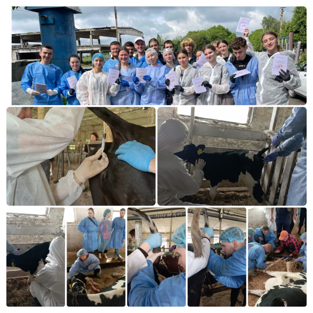 В НДГ «Великоснітинське ім. О.В.Музиченка» студенти відпрацьовували навики клінічного дослідження тварин в умовах ферми. За час практики студенти провели повне клінічне обстеження біля 90 голів ВРХ, телят, відібрали близько 280 проб крові для планового подальшого діагностичного дослідження на лейкоз, відпрацювали техніку постановки зондів, а також провели клінічне дослідження новонародженого теляти.
