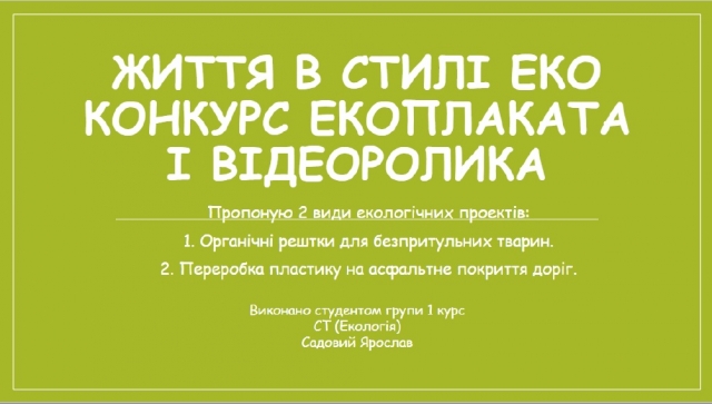Проєкт переконливо довів, що формування екосвідомості серед молоді для успішної реалізації майбутньої професійної кар’єри є важливою складовою освітньої діяльності в університеті. Кульмінацією проєкту стало оприлюднення результатів конкурсу.
