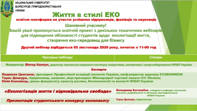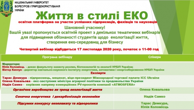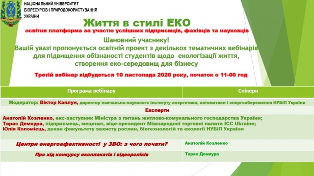 Серія освітніх вебінарів «ЖИТТЯ В СТИЛІ ЕСО» була ініційована Міжнародною торговою палатою України, а реалізована на онлайн-майданчиках ННІ енергетики, автоматики і енергозбереження та факультету захисту рослин, біотехнологій і екології НУБіП України.