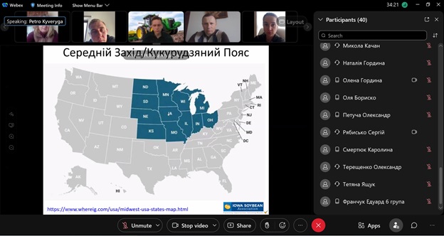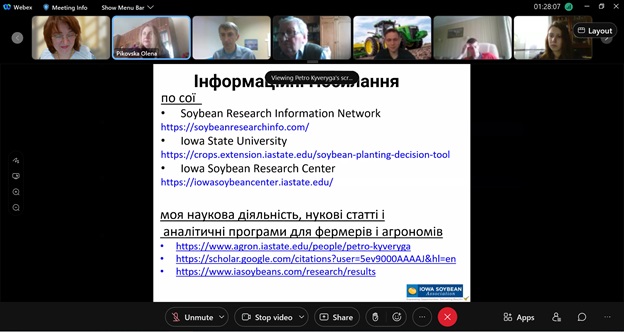 У надважкі для нашої держави дні на агробіологічному факультеті продовжується навчальний процес і міжнародна діяльність. 31 березня 2022 року на запрошення декана агробіологічного факультету, професора Оксани Тонхи студенти та викладачі отримали можливість прослухати лекцію професора Петра Кивериги із штату Айова на тему «Особливості вирощування сої в умовах середнього заходу США».