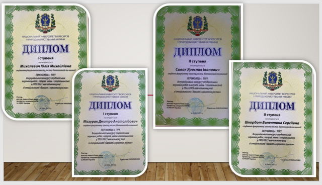 Крім того, ряд студентів спеціальності 202 «Захист і карантин рослин» приймали участь у Всеукраїнському конкурсі студентських наукових робіт з галузей знань і спеціальностей у 2022/2023 навчальному році та зайняли призові місця. Зокрема, молоді та амбіційні вчені представляли свої наукові розробки: Дмитро Мазурак, Юлія Михалевич — «Штучні модулі для перезимівлі корисної ентомофауни у природних умовах», Ярослав Сивак, Валентина Шкорбот — «Конструювання агроландшафтного комплексу насаджень малини для приваблення корисних комах».