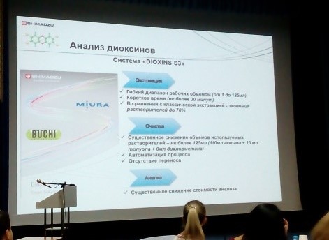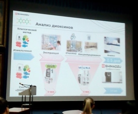 Фахівці фірми Шимадзу в Україні детально представили своє аналітичне обладнання відповідно до різних хіміко-аналітичних завдань лабораторій. Особливо велика увага приділялася сучасному контролю якості і безпеки харчової продукції та води з використанням масспектрометричного аналізу діоксинів, пестицидів, мікотоксинів, антибіотиків, ідентифікація мікроорганізмів за характеристичними білками, молекулярне профілювання мікроорганізмів, механізми стійкості до антибіотиків, вторинний метаболізм мікроорганізмів, ідентифікація фальсифікаторів.