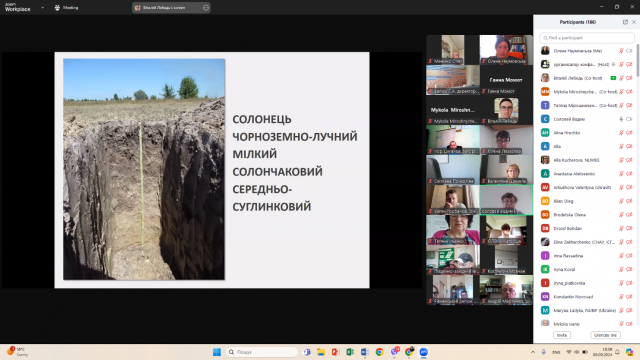 Першим доповідачем був завідувач відділу грунтових ресурсів Інституту, кандидат сільськогосподарських наук, старший науковий співробітник Вадим СОЛОВЕЙ, який виступив із доповіддю «Основні типи грунтів України», де на представленій мапі грунтів України показав їх різноманіття і територіальну строкатість. Особлива увага лектора була зосереджена на фотознімках профілів грунтів із їх короткими характеристиками й особливостями поширення, показниках вмісту і запасів оранічного вуглецю у них, значенні вмісту вологи, як лімітуючого фактору для створення продукційного потенціалу і актуальної родючості чорноземних грунтів. Зупинився лектор і на діагностичних ознаках основних типів грунтів України.