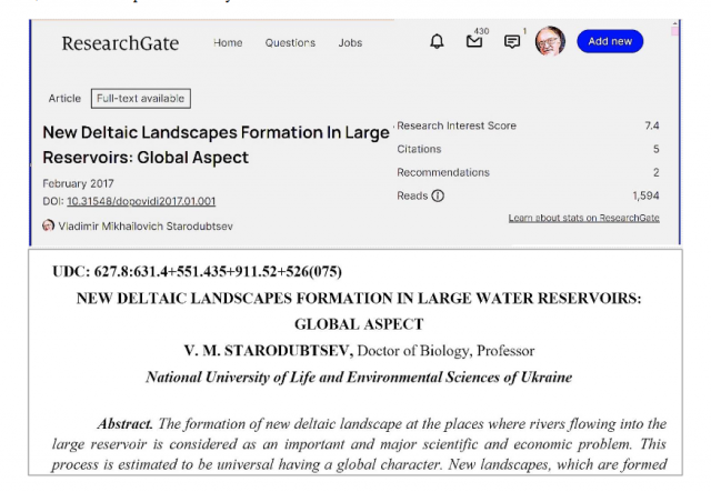 Світова спільнота визнає рейтинг і авторитет українських університетів значною мірою за їх публікаційною активністю й за науковим рівнем статей і монографій, який оцінюється наукометричними базами, зокрема й Research Gate. Й досить показовими у цьому відношенні стали публікації наших екологів в електронному журналі «Наукові доповіді НУБіП України», зокрема стаття професора Стародубцева В.М. (зараз головного наукового співробітника з міжнародних проектів кафедри екології агросфери та екологічного контролю). Його стаття New Deltaic Landscapes Formation In Large Water Reservoirs: Global Aspect, опублікована ще у 2017 році, № 1(65) - http://journals.nubip.edu.ua/index.php/Dopovidi/article/view/8107, досі привертає активну увагу зарубіжних фахівців, й число її прочитань стрімко зростає, досягнувши вже 1594. Й хоча посилань на цю статтю у роботах закордонних науковців ще не багато, бо, вочевидь, наших вчених ще недостатньо знають у світі, пріоритет автора у розробці цієї важливої проблеми безсумнівний.