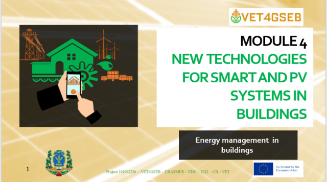 Метод підготовки тренерів в рамках проєкту VET4GSEB передбачав використання платформи електронного навчання (програма обсягом 60 годин з 5 тематичних модулів) із застосуванням відео матеріалів, скрінкастів, інтерактивних презентацій та модульного та фінального тестувань. Тестування онлайн-платформи попередньо здійснили тренери усіх країн-учасниць. Розроблені модулі платформи містять контент інноваційних методів навчання, цифрових технологій, які використовуються в «розумних» будівлях, сучасних технічних рішень з інтеграцією фотоелектричних систем у будівлях, тощо.