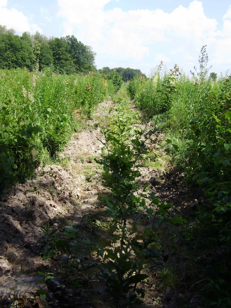 Начальник Вінницького ОУЛМГ Анатолій Бондар зупинився на питаннях формування біологічно стійких високопродуктивних штучних насаджень за участю дуба звичайного. А нам потрібно зберегти саме дуб як головний лісоутворюючий вид подільських лісів. В штучно створених дубових лісах уже відпрацьована технологія вирощування дерев майбутнього. Учасники семінару, оглянувши ділянки дуба звичайного різних років створення, переконалися у високій ефективності проведення лісокультурних заходів. При чому Анатолій Омелянович підкреслив, що лісівники Вінниччини відходять від усталених порядків агротехніки посадки лісових культур. А саме, механізована підготовка ґрунту перед посадкою здійснюється утворенням борозни, потім культиватором КЛБ-1,7 відбувається нагортання відваленого родючого шару ґрунту (рис. 2) куди і висаджуються сіянці дуба, крім цього така операція забезпечує чудову аерацію ґрунту та його рихлення для кращого укорінення сіянців.