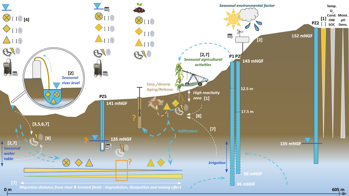 Figure: Schematic representation of groundwater-river interaction in our study case. Yellow triangles, circle and diamond respectively represent contaminants such as pesticides/TPs, pharmaceuticals and PFAS/TFA. Their origin is indicated by the contour color: green for agricultural origin, blue for river origin and orange for mixed origin. The light indicates the reactivity measurement, the fingerprint the isotopy measurement for contaminants and the DNA measurement for bacterial communities, and the two hooks the concentration measurement. The calendar indicates continuous monitoring of physico-chemical and environmental parameters. Blue bars represent wells and piezometers, referencing their altitudes and groundwater levels.