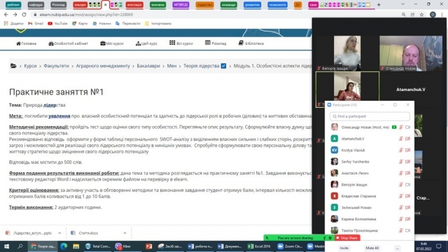 На 1-й парі старшим викладачем кафедри менеджменту ім. проф. Й. С. Завадського Драмарецькою Кристиною Павлівною було проведено практичне заняття для здобувачів 4 курсу 3 групи факультету аграрного менеджменту з дисципліни «Теорія лідерства», а на 2-й парі доцентом кафедри Новаком Олександром Володимировичем було проведено практичне заняття з даної дисципліни для здобувачів 4 курсу 2 групи факультету аграрного менеджменту. На початку практичних занять Кристина Павлівна та Олександр Володимирович проінформували здобувачів вищої освіти про обсяг, мету, завдання дисципліни, очікувані програмні результати від її вивчення, порядок роботи на електронному курсі тощо. Далі студенти перейшли до виконання практичних завдань, які, на основі результатів он-лайн-тестування, передбачали визначення власного типу особистості за окремими параметрами, своїх сильних і слабких сторін в контексті управління та лідерства, а також формування стратегії власного особистісного та професійного розвитку.