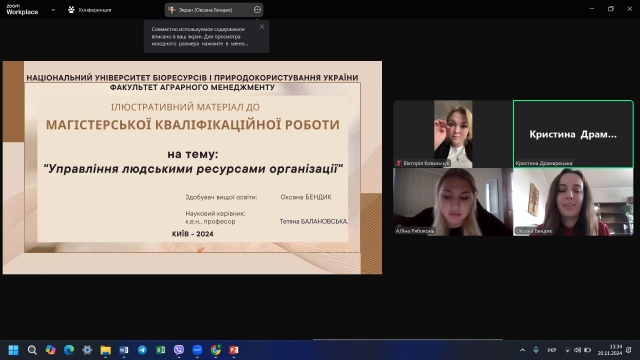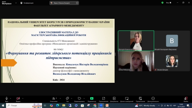 20 листопада 2024 року відповідно до наказу по факультету аграрного менеджменту НУБіП України № 915.3 від 23.10.2024 року про проведення захисту магістерських кваліфікаційних робіт студентами другого (магістерського) рівня спеціальності 073 «Менеджмент» освітньої програми «Менеджмент організацій і адміністрування» заочної форми здобуття вищої освіти факультету аграрного менеджменту розпочала роботу екзаменаційна комісія у складі д.е.н., професора, члена-коресподанта НАН України Шинкарук Л. В.., к.е.н. Вакуленка В. Л., к.е.н., доцента Драмарецької К. П., к.е.н., доцента Тімченко О. Л. Cекретар екзаменаційної комісії – к.е.н. Сотник В. В.